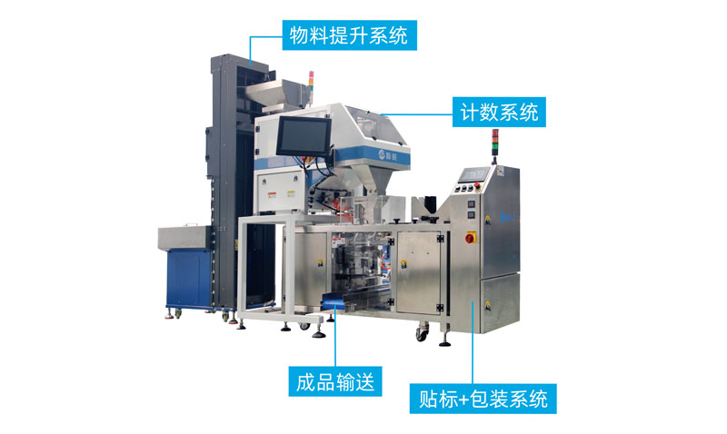 可定制整套計數(shù)包裝系統(tǒng):物料提升系統(tǒng)-計數(shù)系統(tǒng)-貼標(biāo)系統(tǒng)-包裝系統(tǒng)-成品輸送系統(tǒng)